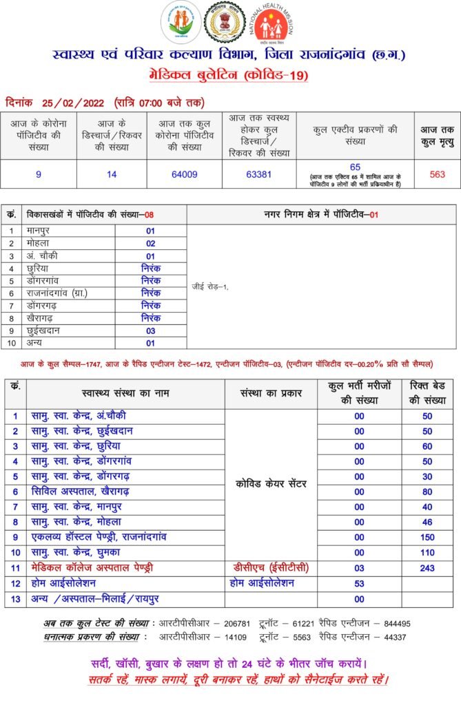 राजनांदगांव. 25 फरवरी को शहर सहित जिले में कुल 9 कोरोना संक्रमित मरीज की पहचान की गई है साथ ही आज कुल 14 मरीज डिस्चार्ज हुए है वहीं जिले कोरोना संक्रमित एक्टीव मरीज की संख्या 65 है.