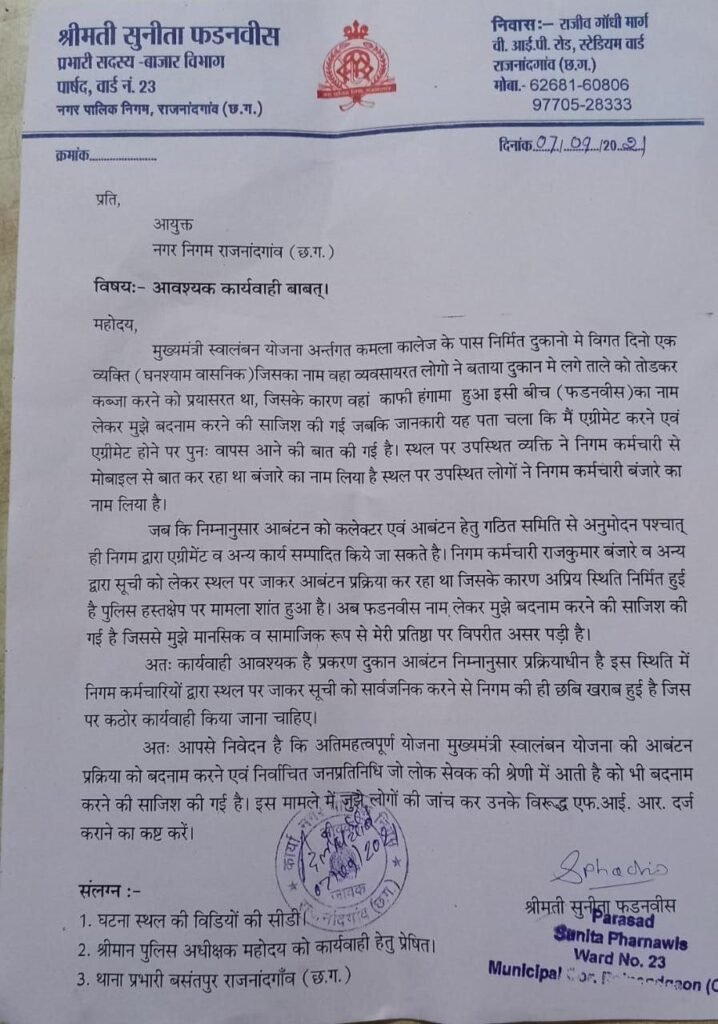 शहर अध्यक्ष , निगम अध्यक्ष , कांग्रेस पार्षद सुनीता फडणवीस ने आयुक्त से जांच की मांग की थी