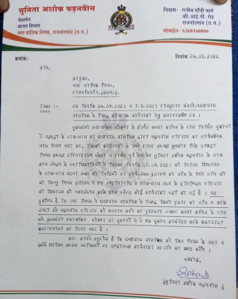 फडणवीस का नाम आने पर पार्षद सुनीता फड़नवीस ने संगठन के अध्यक्ष कुलबीर छाबड़ा , निगम अध्यक्ष हरिनारायण धकेता संघठन के अन्य पदाधिकारियों ने निगम आयुक्त आशुतोष चतुर्वेदी से जांच की मांग की आज लगभग 7 माह से ऊपर होने के बाद सत्ता पक्ष के कांग्रेस पार्षद को न्याय नही मिला साथ ही कांग्रेस के महापौर ने मेयर इन काउंसलिग से दमदार चेयरमैन सही आवाज उठाने वाली एवं गलत तरिके से आबंटित दुकान का विरोध करने पर बाहर कर दिया वहीं निगम व कलेक्टर की समिति ने बाकायदा गिप्ट में घनश्याम वासनकी को 23 नंबर की दुकान इनाम स्वरूप आबंटित कर दी है ऐसी जानकारी मिली है. .