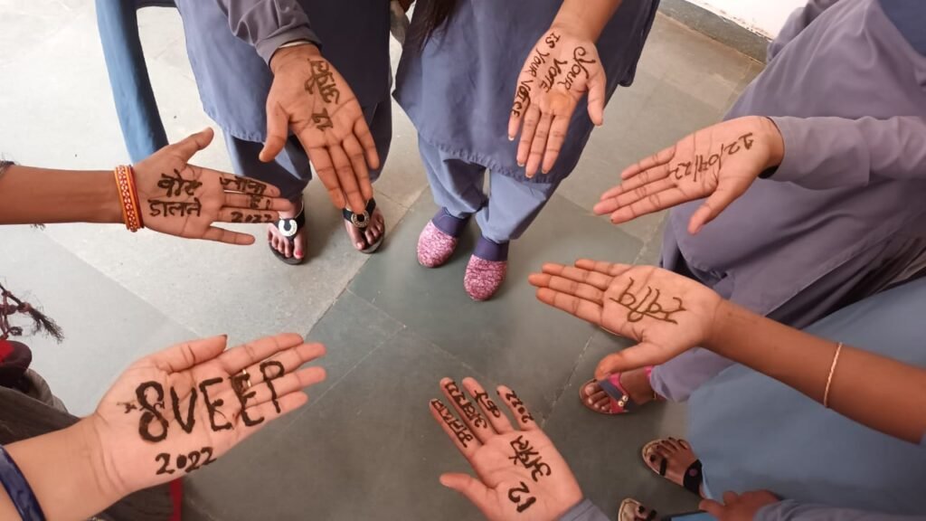 शासकीय आईटीआई छुईखदान में युवा मतदाताओं के लिए गतिविधियां संचालित की गई। जिसमें पोस्टर मेकिंग प्रतियोगिता एवं मेहंदी प्रतियोगिता के माध्यम से प्रशिक्षु छात्र -छात्राओं ने मतदान संदेश दिया। युवा मतदाताओं को मतदान के महत्व विषय पर आवश्यक जानकारियां विशेष सत्र में दी गई। इस दौरान संस्था के प्राचार्य, प्रशिक्षक एवं समस्त स्टॉफ सहित जिला स्वीप टीम उपस्थित थी। इनके द्वारा मतदान का महत्व और मतदान क्यों और कैस करें ? विषय पर आवश्यक जानकारीयां दी गई। प्रशिक्षु छात्र- छात्राओं ने मतदान को प्रेरित करने वाले आकर्षक व कलात्मक मेंहंदी एवं पोस्टर के माध्यम से 12 अप्रैल को अवश्य मतदान करने का संदेश दिया। छात्र- छात्राओं के द्वारा स्वप्रेरित होकर सभी मतदाताओं को मताधिकार के प्रति जागरूक करने की बात कही।
