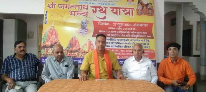 भगवान श्री जगन्नाथ रथयात्रा के संयोजक अशोक जैन , संरक्षक स्वंप्रकाश सोनी एवं सचिव अशोक शास्त्री ने प्रेसवार्ता में बताया कि 27 जून मंगलवार को भगवान श्री जगन्नाथ जी की विशाल एवं भव्य रथयात्रा का आयोजन श्री सांवरिया सेठ मंदिर एवं अंतर्राष्ट्रीय कृष्णभावनामृत संघ इस्कान के द्वारा किया जा रहा है। भगवान जगन्नाथ रथयात्रा दोपहर 02:00 बजे भोजशाला मोतीबाग चौक से प्रारंभ होकर राजवाड़ा चौक आनंद चौपाटी धानमंडी कश्यप भवन मोहन टॉकीज घोड़ा चौपाटी होते हुए त्रिमूर्ति नगर स्थित सांवरिया सेठ मंदिर पहुंचेगी यहां प्रवचन पश्चात छप्पन भोग दर्शन एवं महाआरती के साथ ही सांवरिया सेठ मंदिर में इसका विराम होगा। धार नगर में दूसरी बार भव्य श्री भगवान जगन्नाथ रथयात्रा का आयोजन किया जा रहा है । यात्रा में भगवान श्री जगन्नाथ जी, बलभद्र जी और सुभद्रा जी का विग्रह (प्रतिमा) रथ इंदौर से पधारेंगे जों पूरे धार की जनता को दर्शन देंगे।