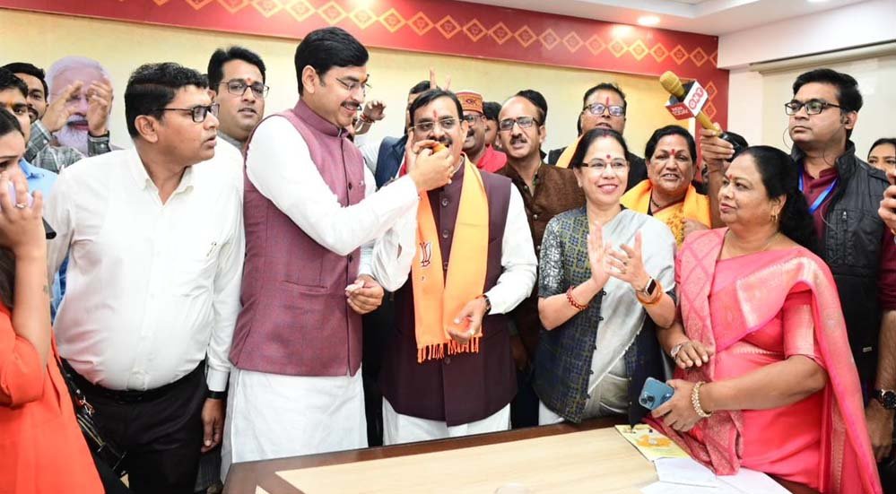 मतगणना में आ रहे रुझान भाजपा खेमे के लिए खुशियां लेकर आ रहे हैं जबकि कांग्रेस इसे लेकर आश्चर्य में है, रुझानों के बाद प्रदेश भाजपा कार्यालय में भाजपा के वरिष्ठ पदाधिकारी पहुंचना शुरू हो गए है, प्रदेश अध्यक्ष वीडी शर्मा सहित अन्य पदाधिकारियों ने एक दूसरे को मिठाई खिलाकर बधाई दी।