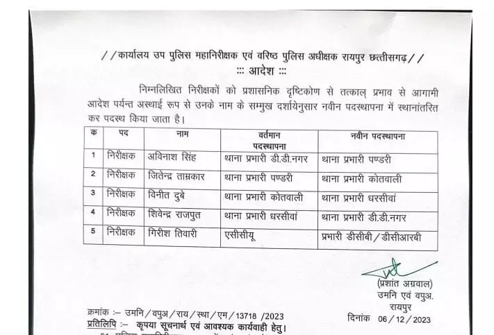 आचार संहिता हटते ही विभागों में अदला-बदली का दौर शुरू हो गया है। रायपुर एसएसपी प्रशांत अग्रवाल ने पांच निरीक्षकों को इधर से उधर किया है।